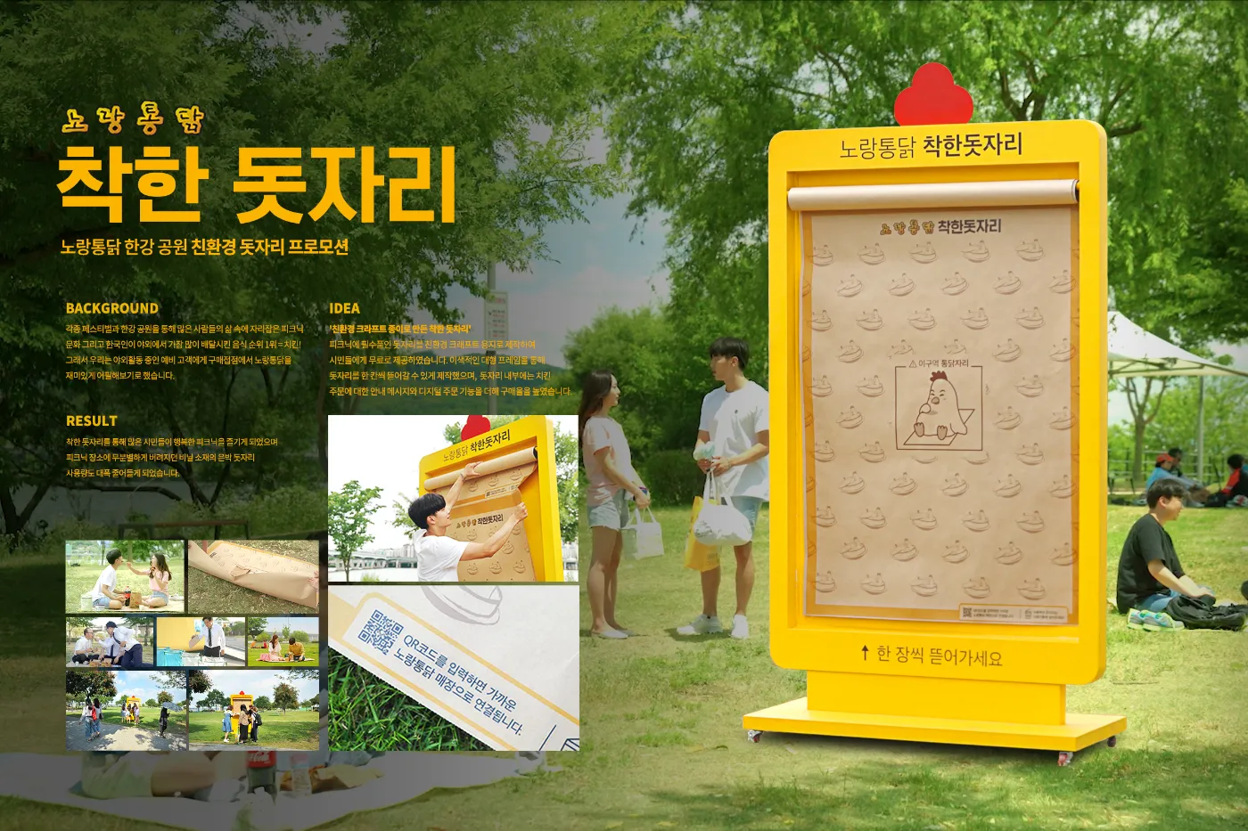 그래서 누구나 현장에서 간편하게 뜯어 사용할 수 있는 돗자리 패널을 설치했고, 친환경 크래프트 종이로 제작해 환경 부담도 줄였습니다. 돗자리 내부에는 QR 코드를 넣어 근처 매장에서 바로 주문할 수 있도록 설계했습니다. 그 결과, 캠페인은 온라인 커뮤니티와 SNS를 중심으로 빠르게 확산되며 언드미디어 효과 35억 원, 브랜드 언급량 820% 증가, 매출은 전년 동월 대비 120% 상승이라는 놀라운 성과로 이어졌습니다.
