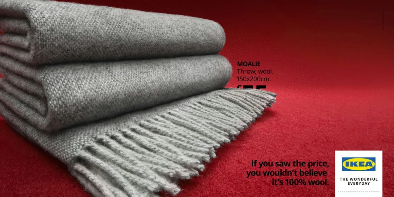 source : IKEA 울 100%(Wool): 'MOALIE(모알리에)' 담요는 포근한 텍스처를 보여주며 순모 소재임을 강조했죠.