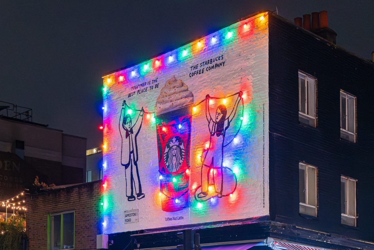 'Drawn Together'라는 이 캠페인은 화려한 영상이나 CG 대신 우리가 매장에서 흔히 보는 검은색 매직 펜을 선택했습니다. 아티스트 제프 맥페트릿지의 손을 빌려 건물 벽면을 캔버스로 삼았고, 컵에 이름을 쓸 때의 그 투박한 선으로 연말의 설렘을 가득 채웠습니다. 실제 전구와 어우러진 그림은 마치 누군가 거리에 따뜻한 낙서를 남긴 듯한 느낌을 줍니다.